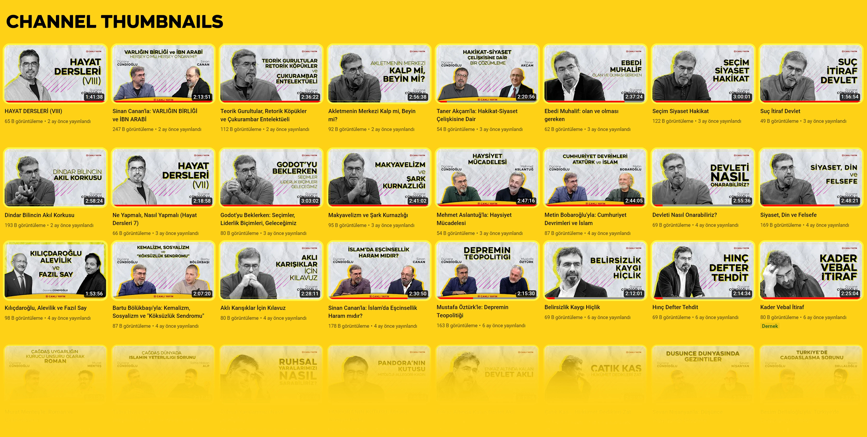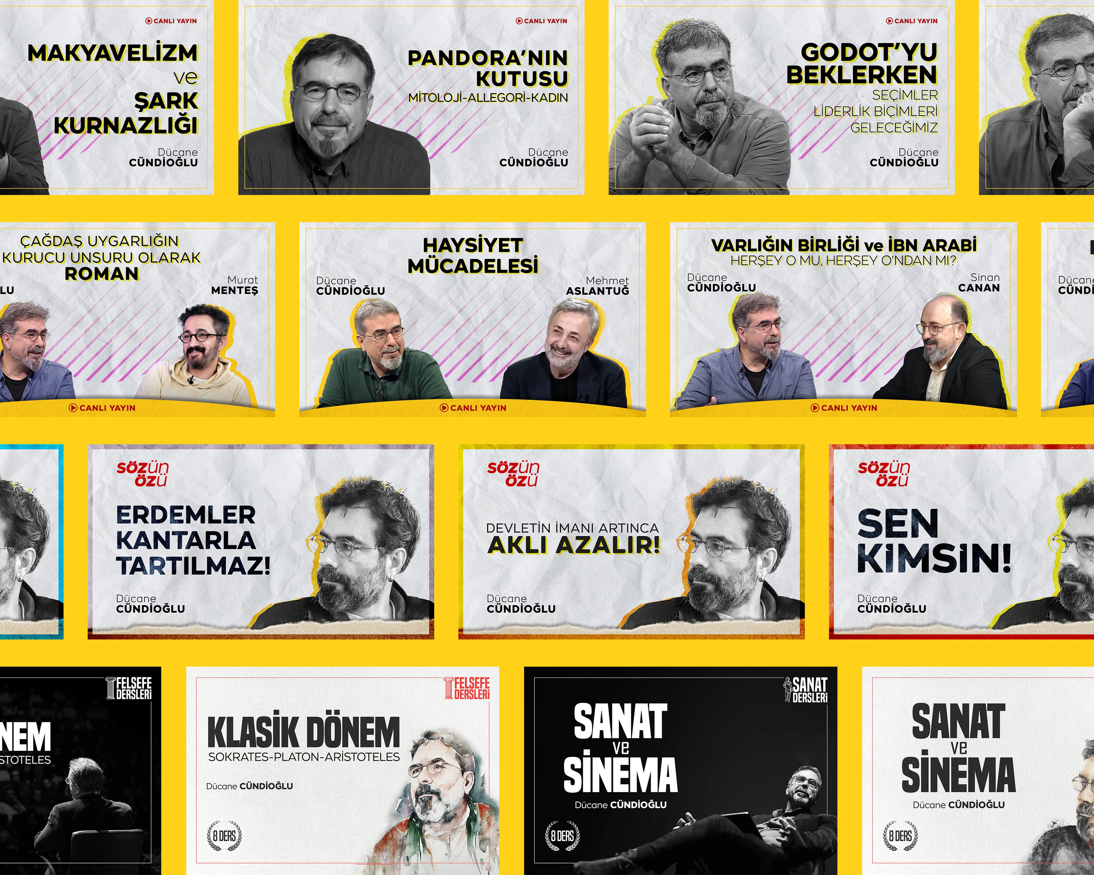 Türkiye’nin önde gelen felsefecilerinden Dücane Cündioğlu için hazırladığımız YouTube kanalı kapak ve banner tasarımlarında, düşünürün derinlikli ve özgün üslubunu yansıtmaya özen gösterdik. Tasarımlarda sade ve zarif bir yaklaşımı benimseyerek, izleyicinin Cündioğlu’nun felsefi içeriklerine odaklanmasını sağlayacak bir estetik oluşturduk.