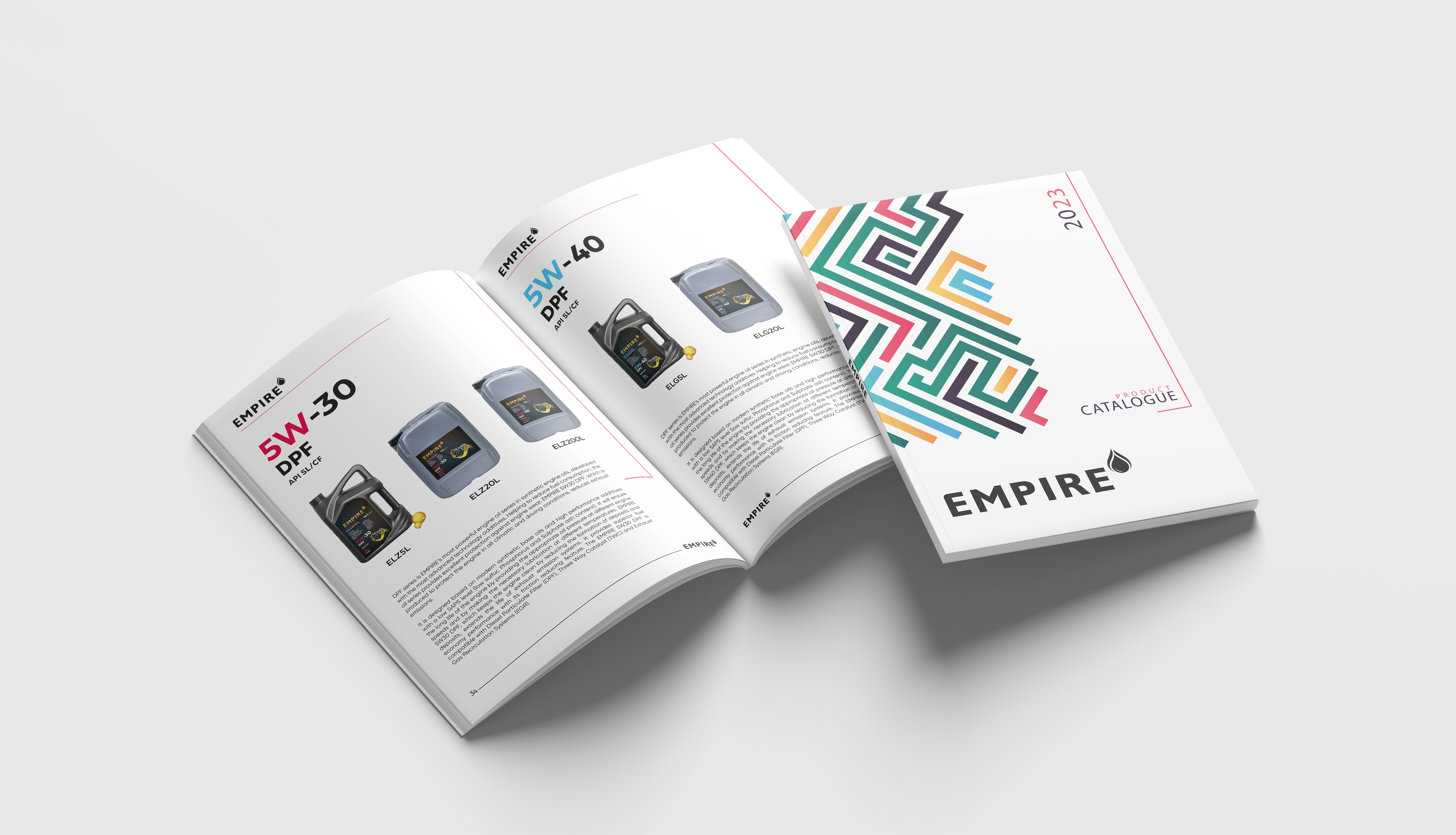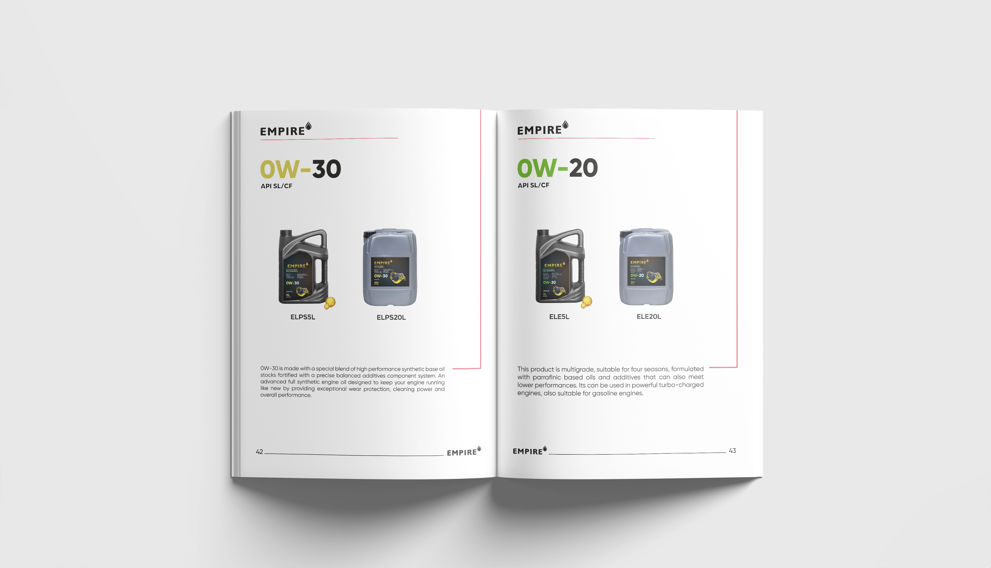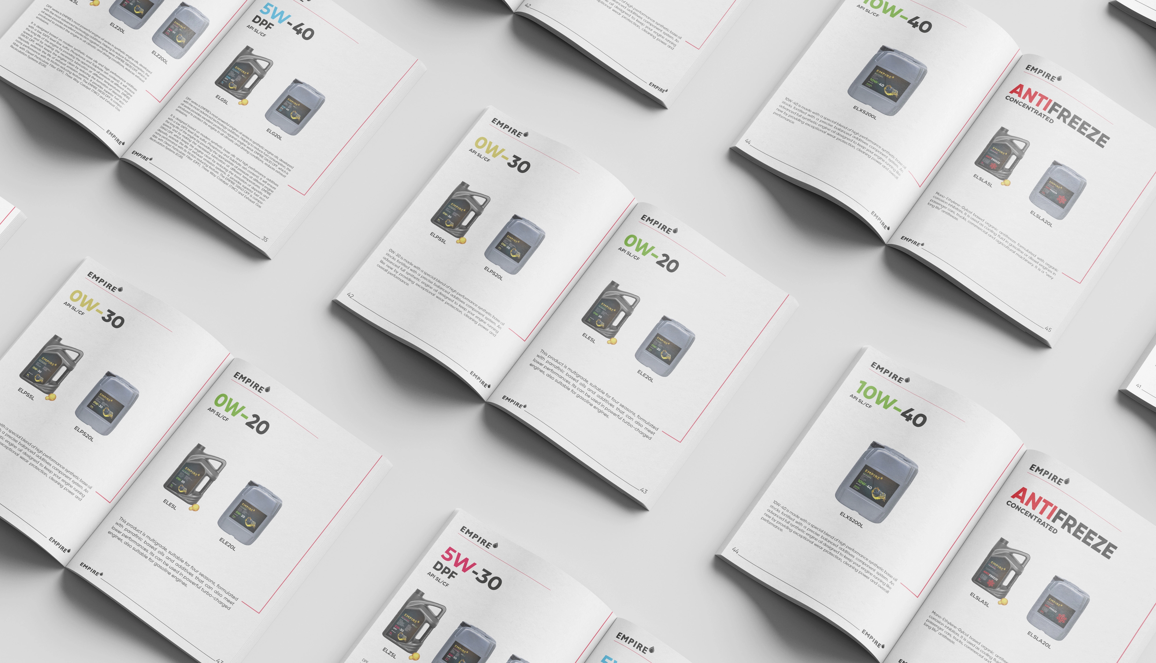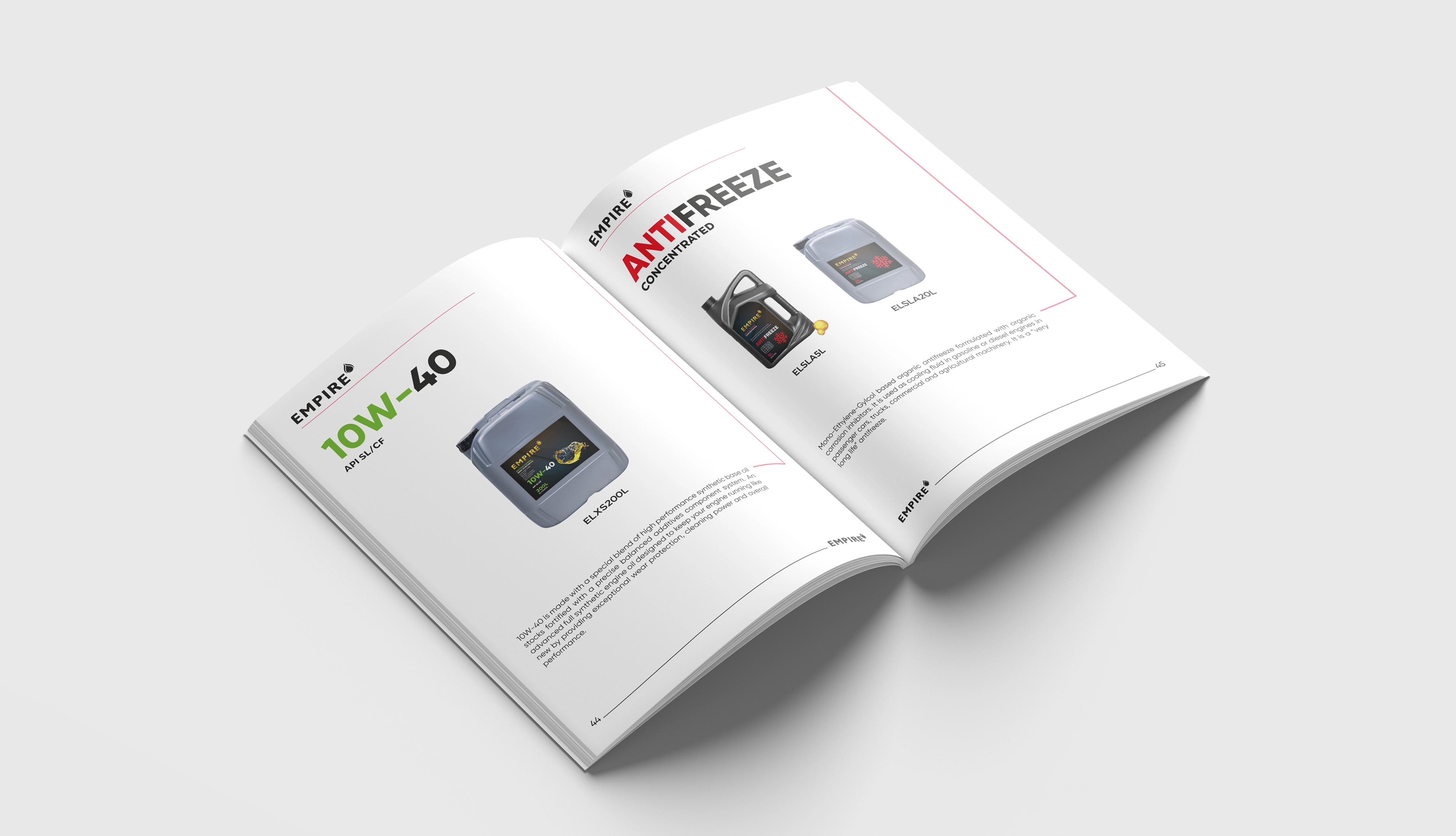 Madeni yağ olan Empire Oil için hazırladığımız katalog ve bidon etiket tasarımları, ürün yelpazesini profesyonel ve dikkat çekici bir şekilde sunmayı amaçlamaktadır. Bu projede, sektörün teknik gereksinimlerini göz önünde bulundurarak hem işlevsel hem de estetik olarak etkileyici tasarımlar oluşturduk.